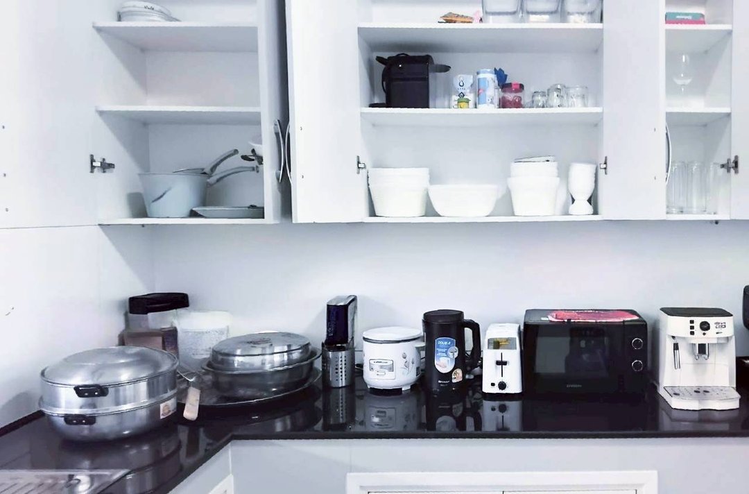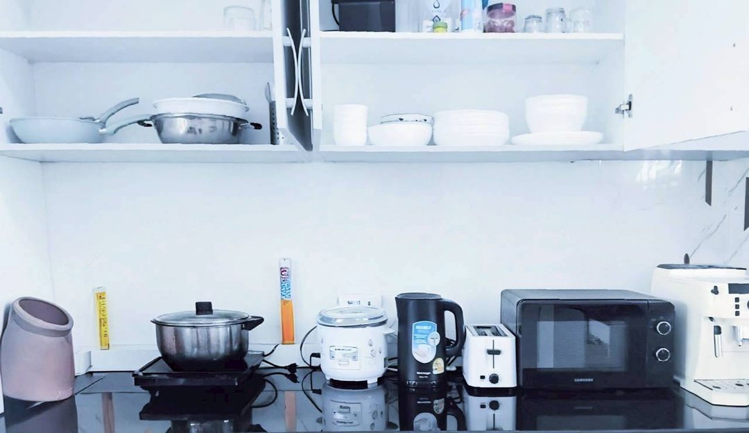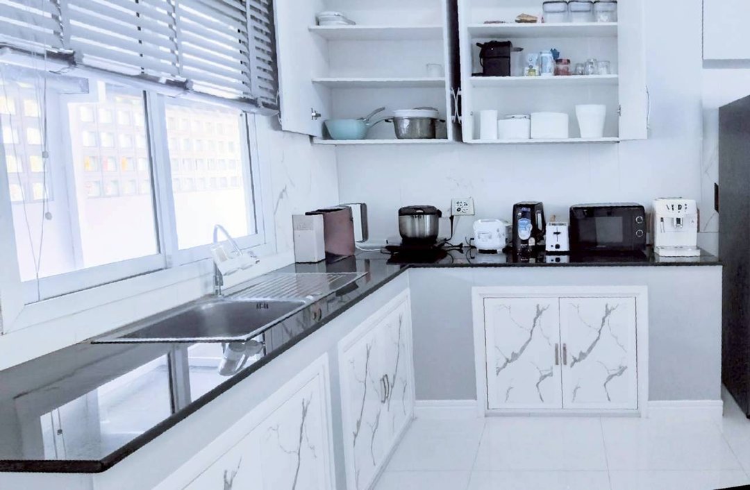 - ห้องครัวพร้อมอุปกรณ์ทำอาหาร เครื่องใช้ไฟฟ้า ตู้เย็นเครื่องทำกาแฟ เตาเเม่เหล็กกระทะไฟฟ้า