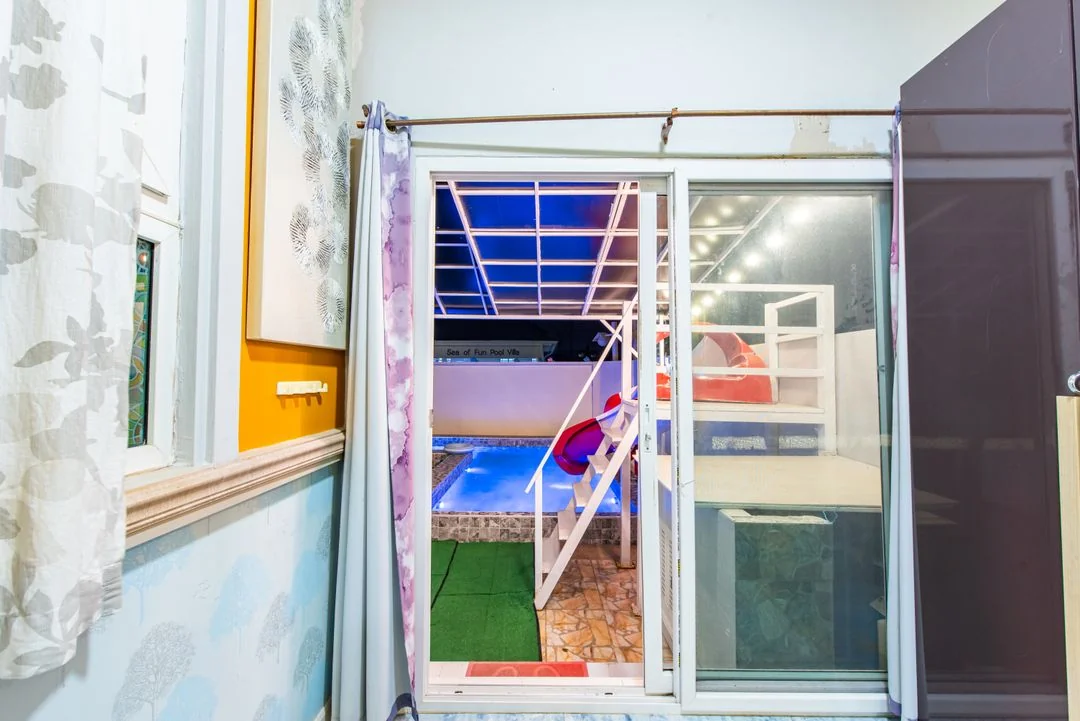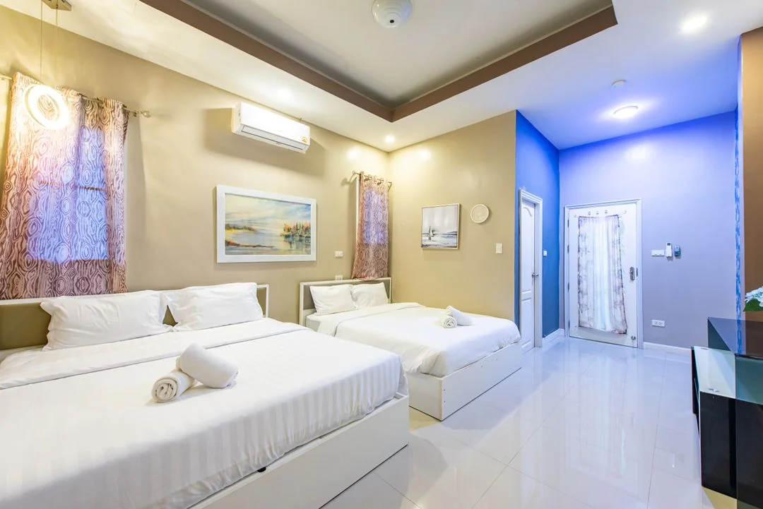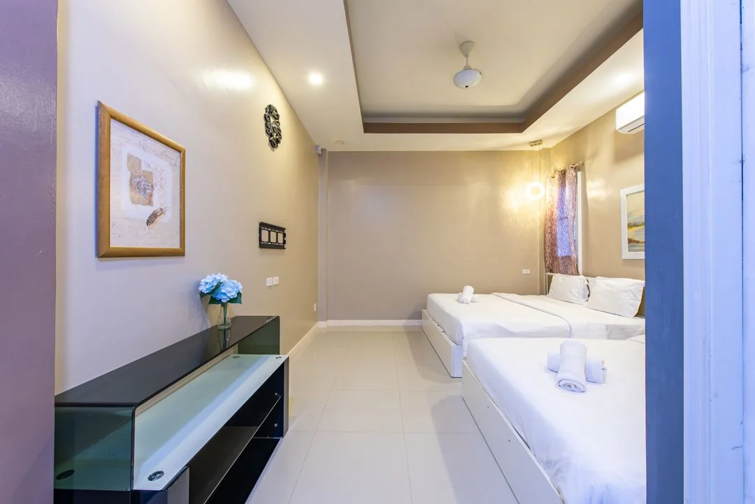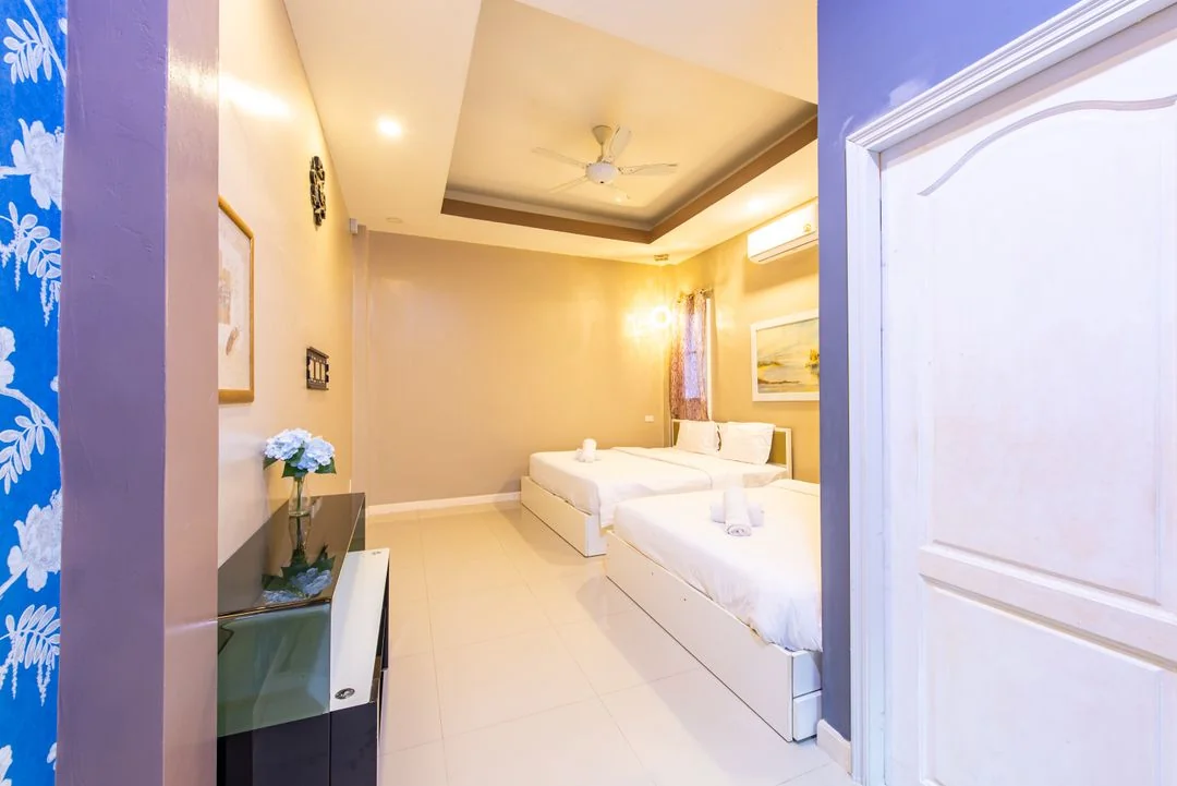 - -ห้องนอนที่ 1 ติดกับสระ มีห้องน้ำในตัว มีเตียงนอน 2 เตียง ขนาด 5ฟุต1 เตียง ขนาด 6 ฟุต 1 เตียง