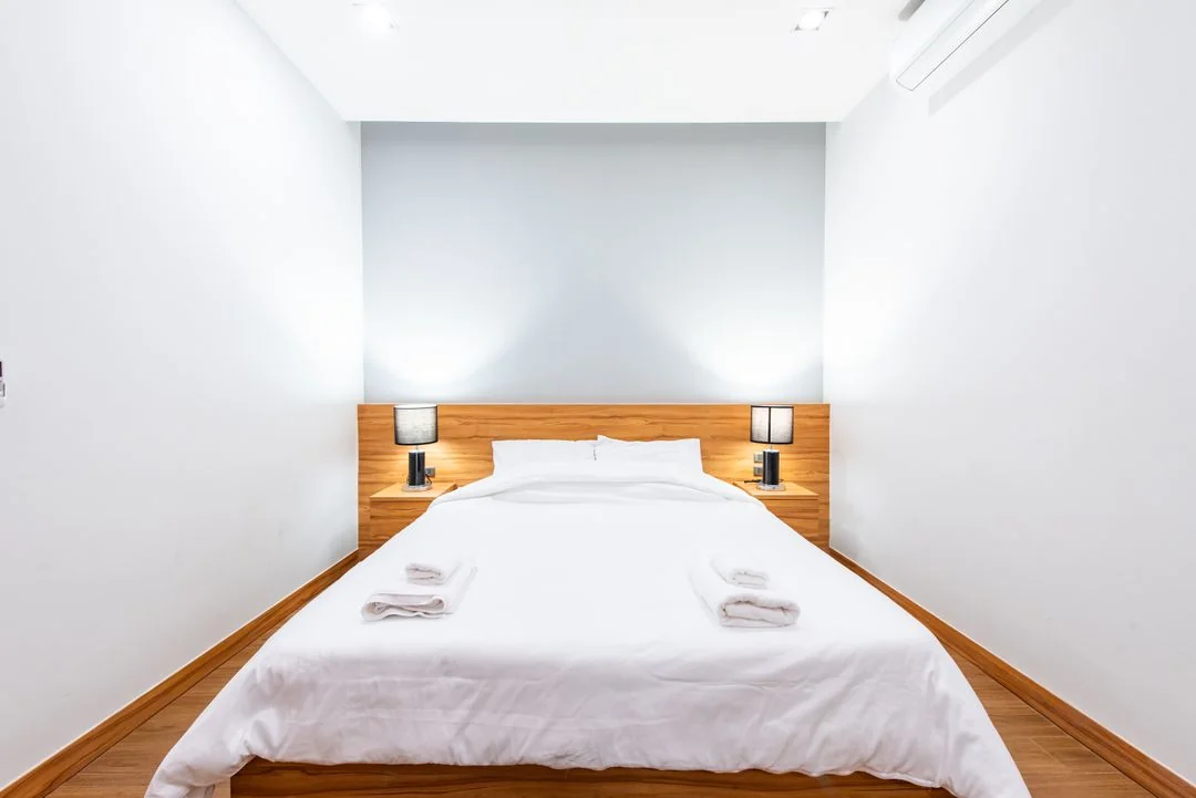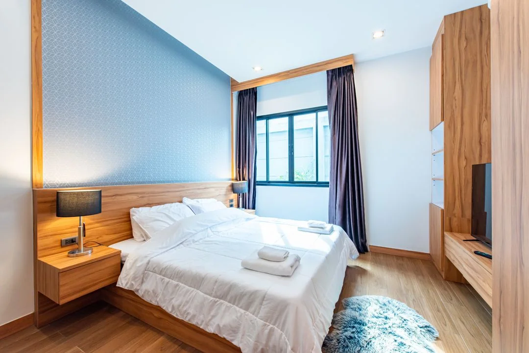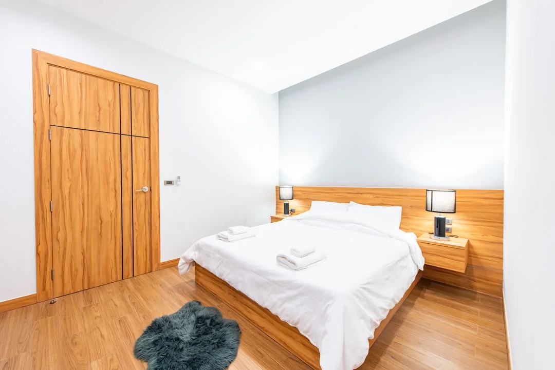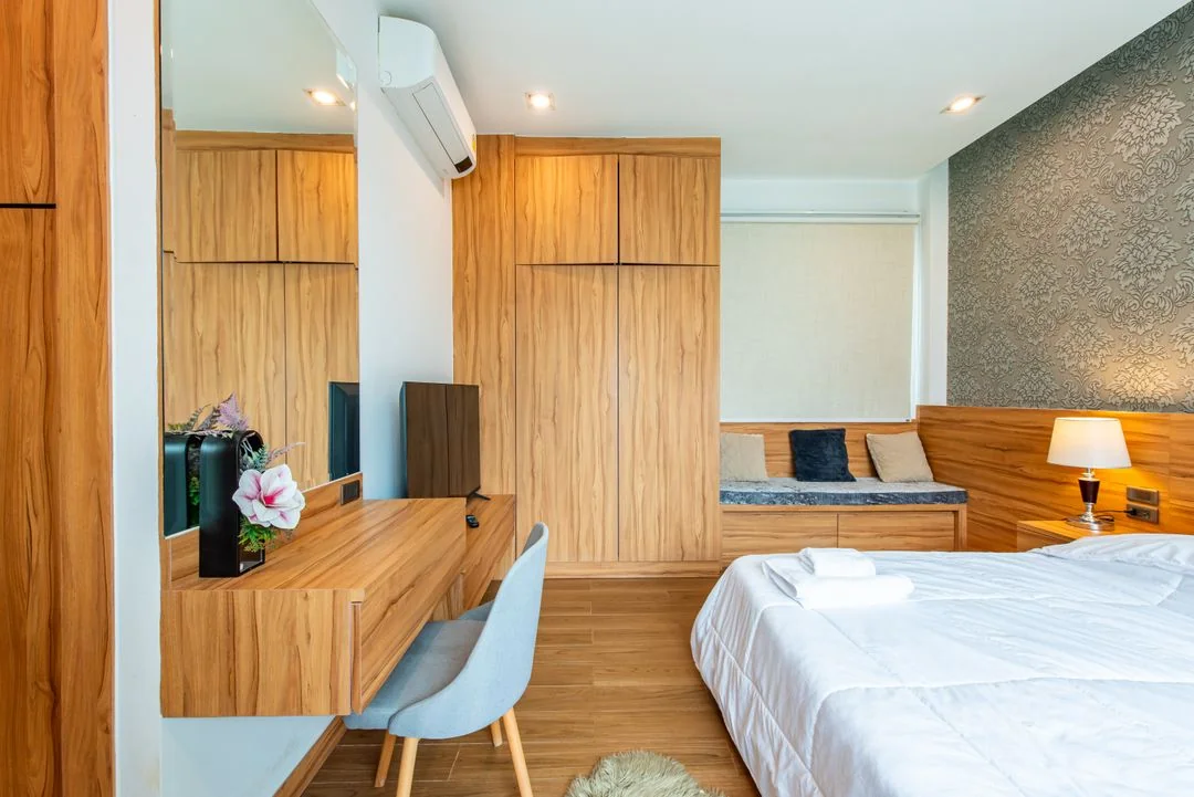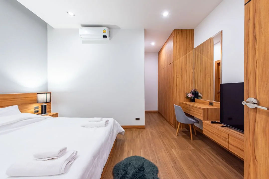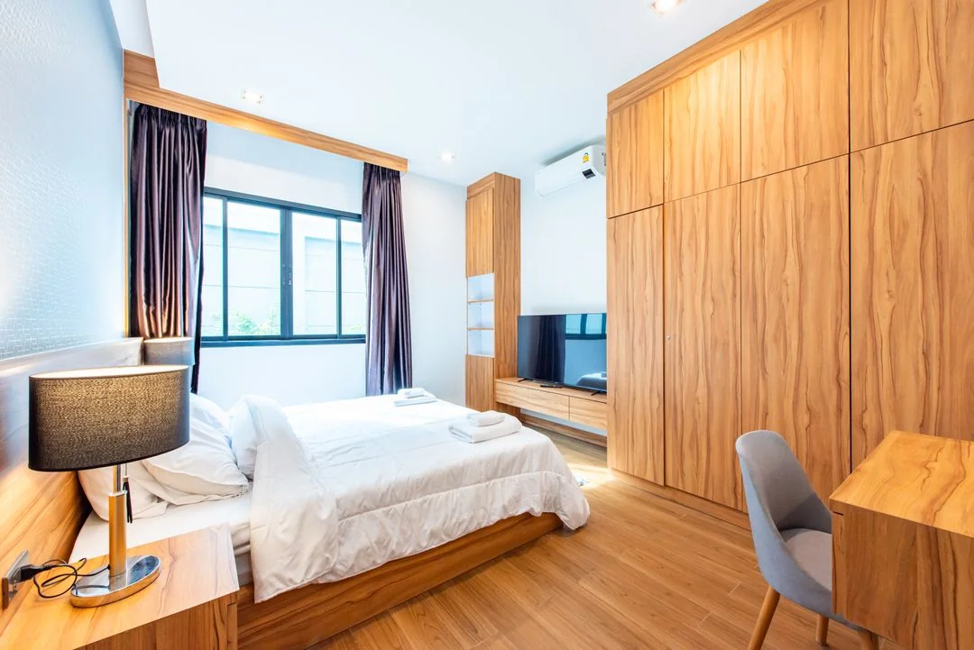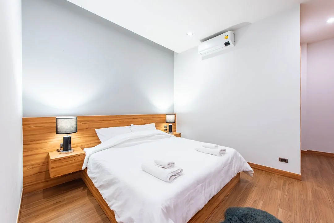 • ห้องนอนที่ 1 มีเตียง 6 ฟุต 1 เตียง ห้องน้ำในตัว