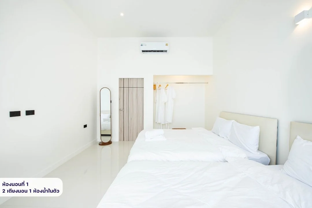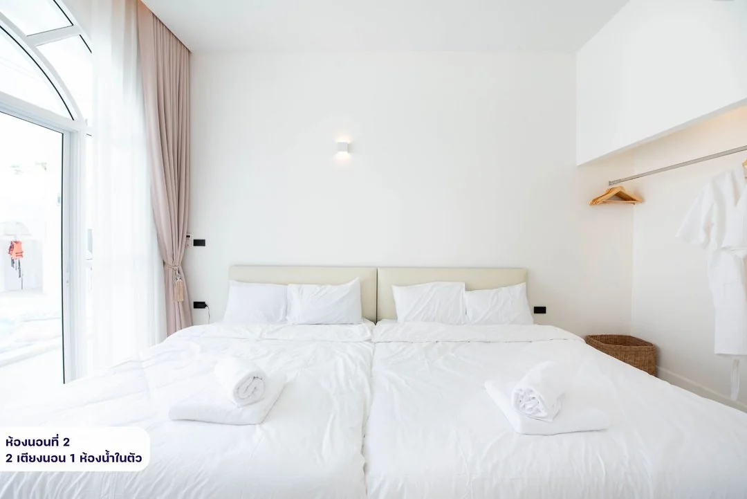 - -ห้องนอนที่ 1 มีเตียง 5 ฟุต 2 เตียง ห้องน้ำในตัว
